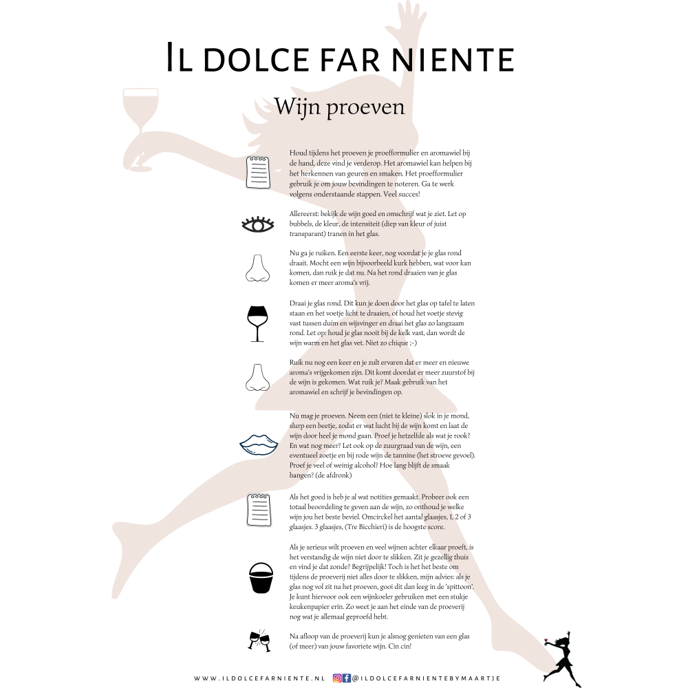 Een mooi gedrukte handleiding voor jouw thuisproeverij incl. toelichting op het proeven, een proefformulier met ruimte voor 6 wijnen en een aromawiel.